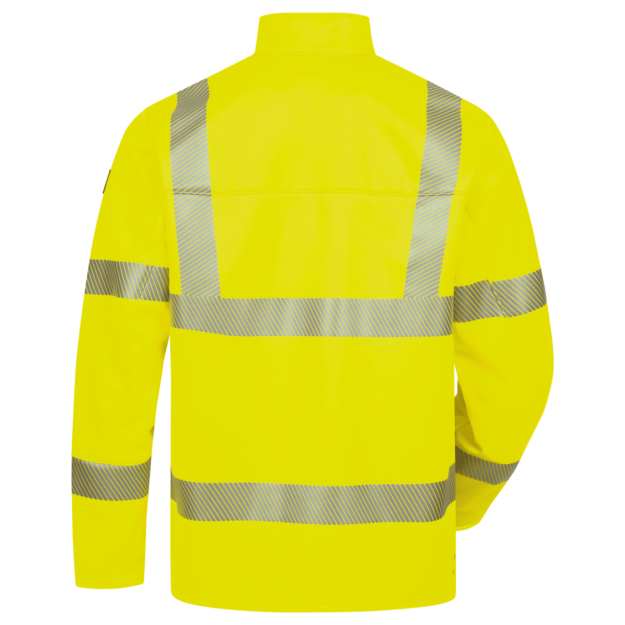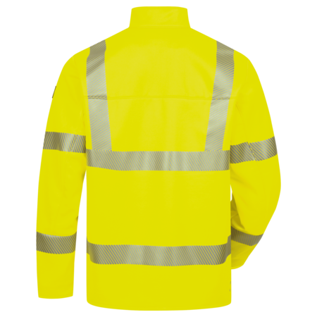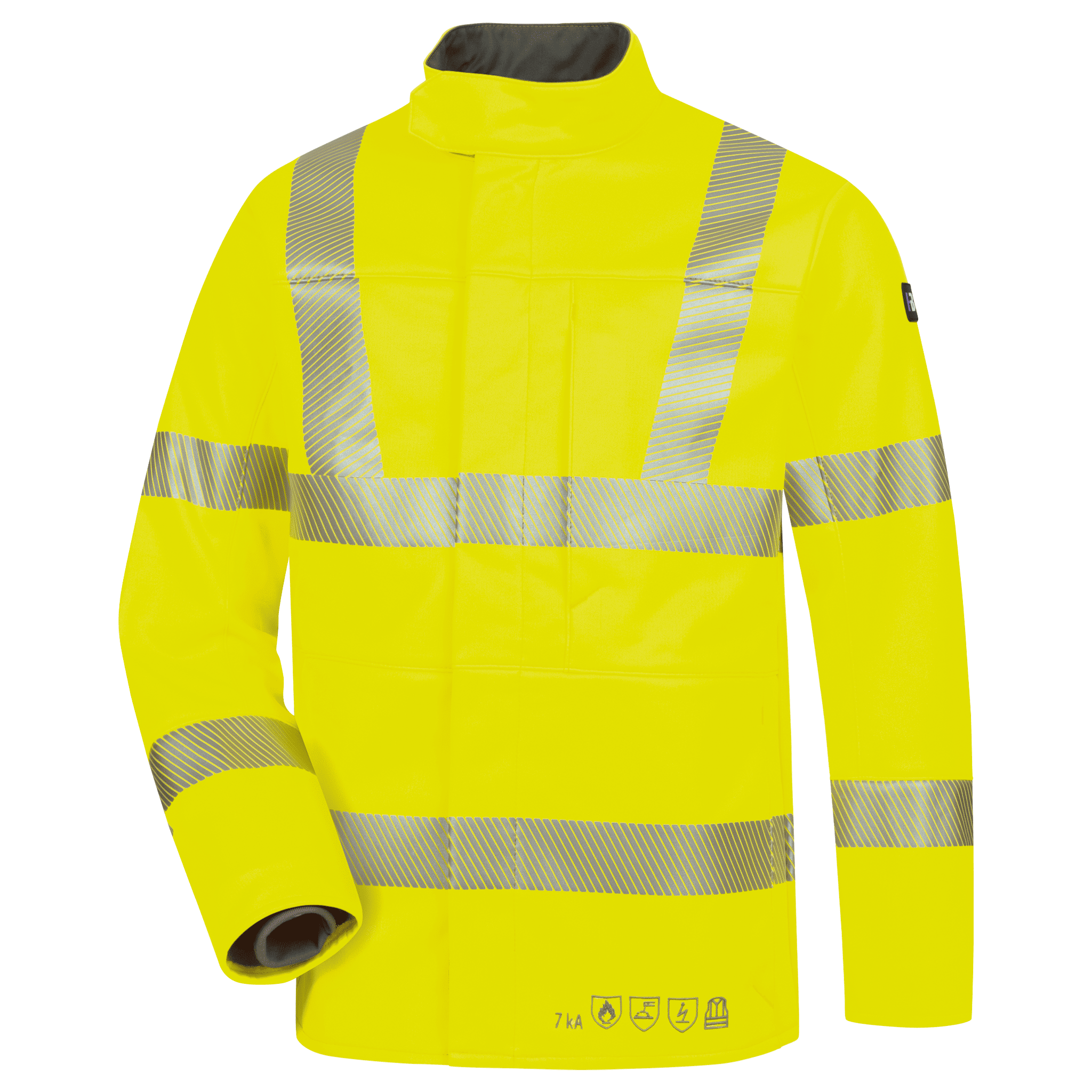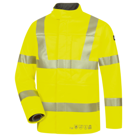 Hoher Stehkragen mit Klettverschluss • Verschlussleiste mit verdecktem Reißverschluss • Napoleontasche links und 2 seitliche Eingriffstaschen, jeweils mit Reißverschluss • zwei Innentaschen • Ärmelsaum mit innenliegendem Strickbündchen • FR-Reflexstreifen in Body-Language • Normenpiktogrammen als FR-DirekteinstickungEinsatzgebiete