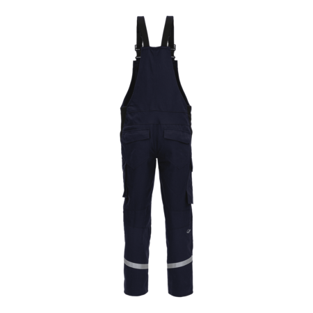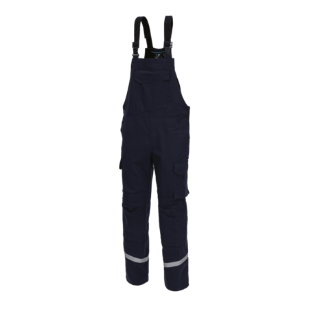 Single-coloured • stretch straps with fix-lock clip • front with zip-fly • bib with outer pocket with flap and covered snap fastener • 2 slant pockets • 1 hip pocket with flap and covered snap fastener • 1 ruler pocket on the right with flap and snap fastener • 1 bellow pocket on the right with flap and snap fastener • knee pockets with hook and loop fastener • flame-retardant reflective stripes suitable for industrial laundry • no Hi-Vis protective clothing acc. to EN ISO 20471.Fields of application