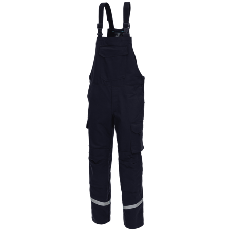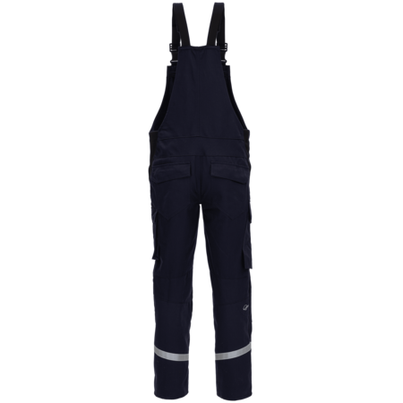 Single-coloured • stretch straps with fix-lock clip • front with zip-fly • bib with outer pocket with flap and covered snap fastener • 2 slant pockets • 1 hip pocket with flap and covered snap fastener • 1 ruler pocket on the right with flap and snap fastener • 1 bellow pocket on the right with flap and snap fastener • knee pockets with hook and loop fastener • flame-retardant reflective stripes suitable for industrial laundry • no Hi-Vis protective clothing acc. to EN ISO 20471.Fields of application