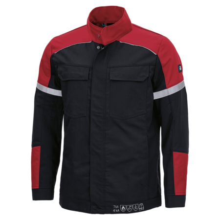 Two-coloured • stand-up collar • covered front zip with covered snap fastener • 2 attached breast pockets with flaps and covered snap fasteners • side pockets with flaps and covered snap fastener • 1 inner pocket with hook & loop fastener • leasing neck label • embroidered FR standard pictograms on the front • reflective elements suitable for industrial laundry on front back and sleeves • no Hi-Vis protective clothing acc. to EN ISO 20471.Fields of application