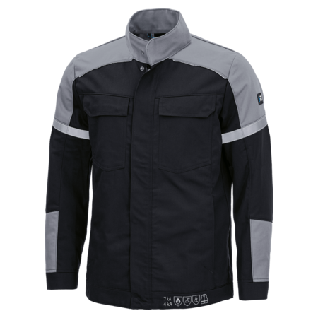 Two-coloured • stand-up collar • covered front zip with covered snap fastener • 2 attached breast pockets with flaps and covered snap fasteners • side pockets with flaps and covered snap fastener • 1 inner pocket with hook & loop fastener • leasing neck label • embroidered FR standard pictograms on the front • reflective elements suitable for industrial laundry on front back and sleeves • no Hi-Vis protective clothing acc. to EN ISO 20471.Fields of application