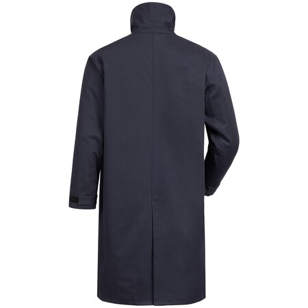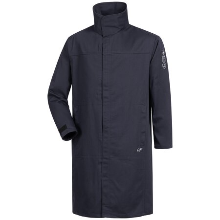 Single-coloured • completely double-layered • high band collar • front with covered 2-way zipper plus hook and loop fastener • 2 vertical side pockets with covered zipper • moving pleat for easy walking on the back • sleeve hem with adjustable hook and loop fastener • FR leasing collar • standard pictograms on the left sleeve.