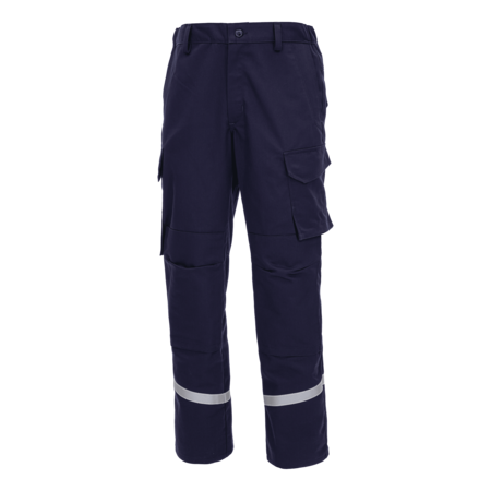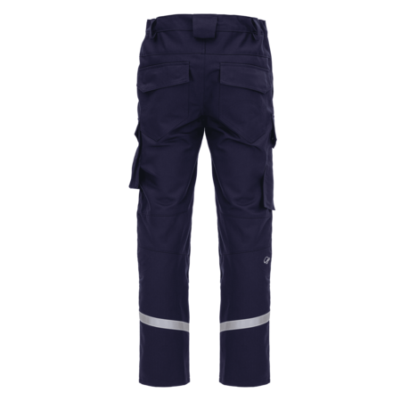 Single-coloured • waistband with button and zip-fly • 2 slant pockets •1 hip pocket with flap and covered snap fastener • 1 ruler pocket on the right with flap and snap fastener • 1 bellow pocket on the right with flap and snap fastener • knee pockets with hook and loop fastener • reflective elements • flame-retardant reflective stripes suitable for industrial laundry • no Hi-Vis protective clothing acc. to EN ISO 20471.Fields of application