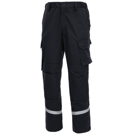Single-coloured • waistband with button and zip-fly • 2 slant pockets •1 hip pocket with flap and covered snap fastener • 1 ruler pocket on the right with flap and snap fastener • 1 bellow pocket on the right with flap and snap fastener • knee pockets with hook and loop fastener • reflective elements • flame-retardant reflective stripes suitable for industrial laundry • no Hi-Vis protective clothing acc. to EN ISO 20471.Fields of application