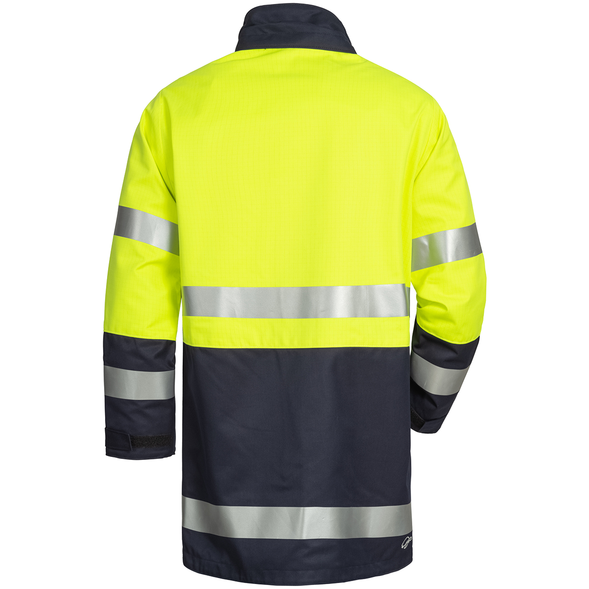 Two-coloured • flame-retardant upper material with liner • sealed seams • high band collar with covered buttons for hood attachment • hood suitable for wearing with or without helmet • covered 2-way zip fastener plus drip moulding with snap fasteners • 1 front pocket on the left, 1 mobile phone pocket (bellows) on the right, covered with laminated weather protection, and 2 side pockets (bellows) - each with flap and covered snap fastener • inside zipper to hook the fleece jacket • flame-retardant reflective stripes, suitable for industrial laundry • wristbands with strap and hook and loop fastener • FR standart pictograms on the collar • compatibility with Fleecejacket 07015 19095 000Fields of application