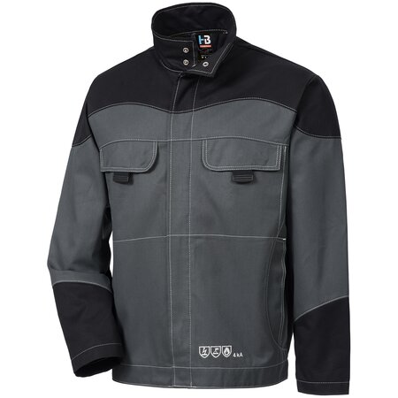 Two-coloured • raw white contrast stitching • stand-up collar with covered snap fastener • covered zip • 2 front pockets (one as an attached pocket) with flap, covered snap fastener and tab to open • 1 inner pocket left with snap fastener • 2 side pockets with zip • sleeve hem adjustable with snap fastener covered on inside • attached waistband with covered snap fastener • standard pictograms on front as FR direct stitching.Fields of application