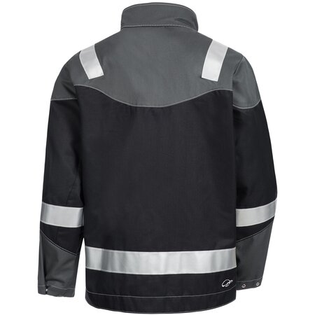 Two-coloured • raw white contrast stitching • stand-up collar with covered snap fastener • covered zip • 2 front pockets (1 as an attached pocket) with flap, covered snap fastener and tab to open • 1 inner pocket left with snap fastener • 2 side pockets with zip • sleeve hem adjustable with snap fastener covered on inside • attached waistband with covered snap fastener • standard pictograms on front as FR direct stitching • flame-retardant reflective stripes suitable for industrial laundry • no Hi-Vis protective clothing acc. to EN ISO 20471Fields of application