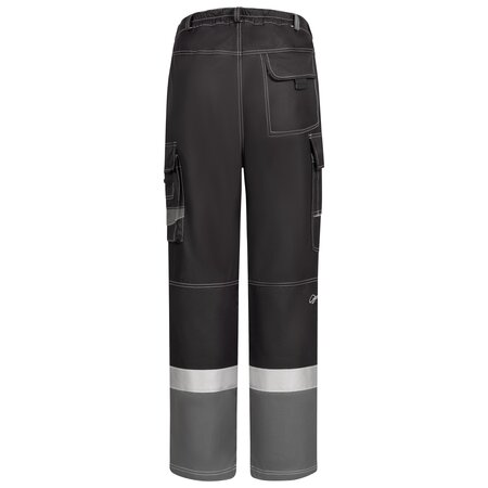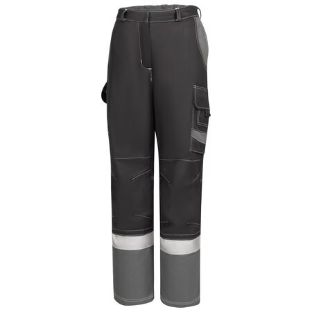 Two-coloured • raw white contrast stitching • waistband with covered button closure an elastic in the back • zip fly • 2 slant pockets • 1 hip pocket on the right and 1 bellows pocket on the left with additional, attached pocket - each with flap, covered snap fastener and tab to open • 1 ruler pocket on the right (+pen pocket) • 2 knee pockets outside with hook and loop fastener • flame-retardant reflective stripes suitable for industrial laundry • no Hi-Vis protective clothing acc. to EN ISO 20471Fields of application