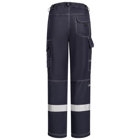 raw white contrast stitching • waistband with covered button closure an elastic in the back • zip fly • 2 slant pockets •1 hip pocket on the right and 1 bellows pocket on the left with additional, attached pocket - each with flap, covered snap fastener and tab to open • 1 ruler pocket on the right (+pen pocket) • 2 knee pockets outside with hook and loop fastener • flame-retardant reflective stripes suitable for industrial laundry • no Hi-Vis protective clothing acc. to EN ISO 20471