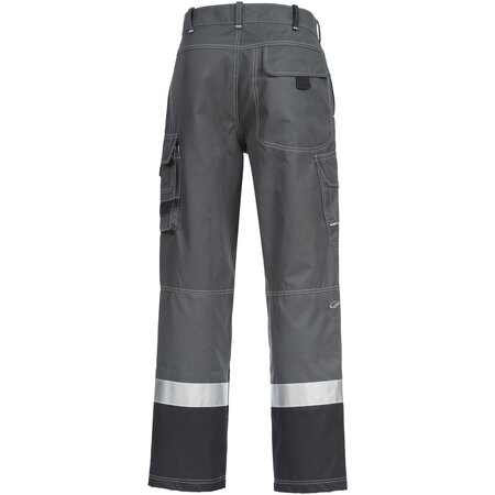 Two-coloured • raw white contrast stitching • waistband with covered button closure • zip fly • 2 slant pockets • 1 hip pocket on the right and 1 bellows pocket on the left with additional attached pocket - each with flap, covered snap fastener and tab to open • 1 ruler pocket on the right (+pen pocket) • knee pockets with hook and oop fastener • flame-retardant reflective stripes suitable for industrial laundry • no Hi-Vis protective clothing acc. to EN ISO 20471Fields of application