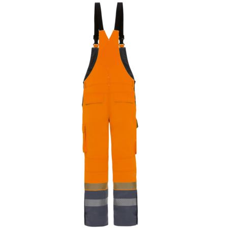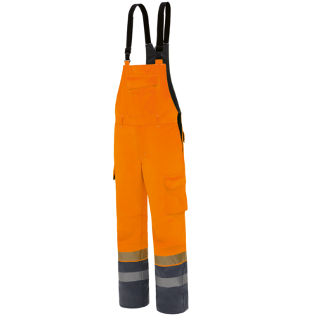2-coloured • flame retardant outer fabric with liner, welded seams • adjustable length straps • diamond shaped kidney protection • 1 bib pocket with inside pen pocket with flap and concealed push buttons • 2 wing pockets • inside back pockets with flap and concealed push buttons • 1 free-hanging folding rule pocket on the right and 1 bellows pocket on the left with inside cell phone pocket - each with flap and concealed press studs • Entry on both sides with knitted wedge • Slit with zipper and Velcro each at the bottom of the trouser leg for easier entry • Leg cuff with wetness barrier • flame retardant, segmented FR reflective stripesFields of application
