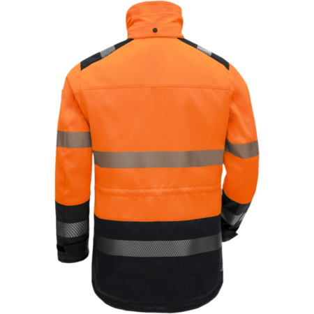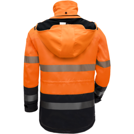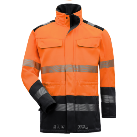 2-coloured • flame retardant outer fabric with liner, welded seams • stand-up collar with concealed push buttons, chin guard and zipper for hood • covered 2-way zip plus drip moulding • 2 chest pockets with flap and concealed push buttons • 2 side pockets with zipper • 1 inside pocket on the left with Velcro closure • extended back • waist and hem width adjustable via cord • inside zipper to hook the fleece jacket • sleeves bottom width adjustable with Velcro closure • flame retardant, segmented FR reflective stripes • standard pictograms as FR embroidery at the front • compatibility with Fleecejacket 07015 19021 000 / 001, 07015 19019 000 / 001Fields of application