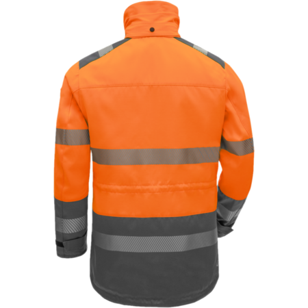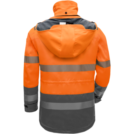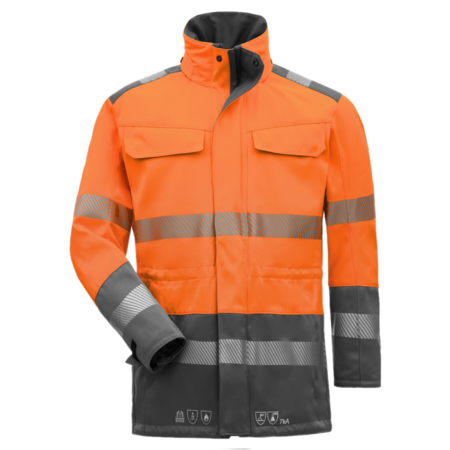 2-coloured • flame retardant outer fabric with liner, welded seams • stand-up collar with concealed push buttons, chin guard and zipper for hood • covered 2-way zip plus drip moulding • 2 chest pockets with flap and concealed push buttons • 2 side pockets with zipper • 1 inside pocket on the left with Velcro closure • extended back • waist and hem width adjustable via cord • inside zipper to hook the fleece jacket • sleeves bottom width adjustable with Velcro closure • flame retardant, segmented FR reflective stripes • standard pictograms as FR embroidery at the front • compatibility with Fleecejacket 07015 19021 000 / 001, 07015 19019 000 / 001Fields of application
