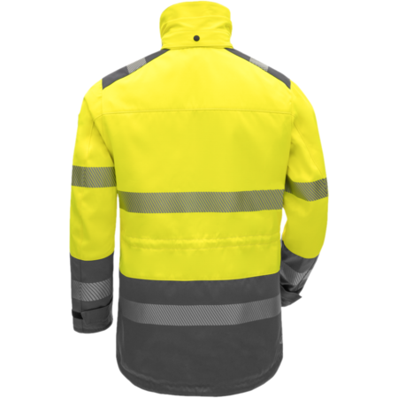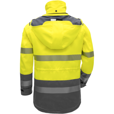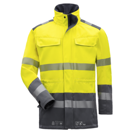 2-coloured • flame retardant outer fabric with liner, welded seams • stand-up collar with concealed push buttons, chin guard and zipper for hood • covered 2-way zip plus drip moulding • 2 chest pockets with flap and concealed push buttons • 2 side pockets with zipper • 1 inside pocket on the left with Velcro closure • extended back • waist and hem width adjustable via cord • inside zipper to hook the fleece jacket • sleeves bottom width adjustable with Velcro closure • flame retardant, segmented FR reflective stripes • standard pictograms as FR embroidery at the front • compatibility with Fleecejacket 07015 19021 000 / 001, 07015 19019 000 / 001Fields of application