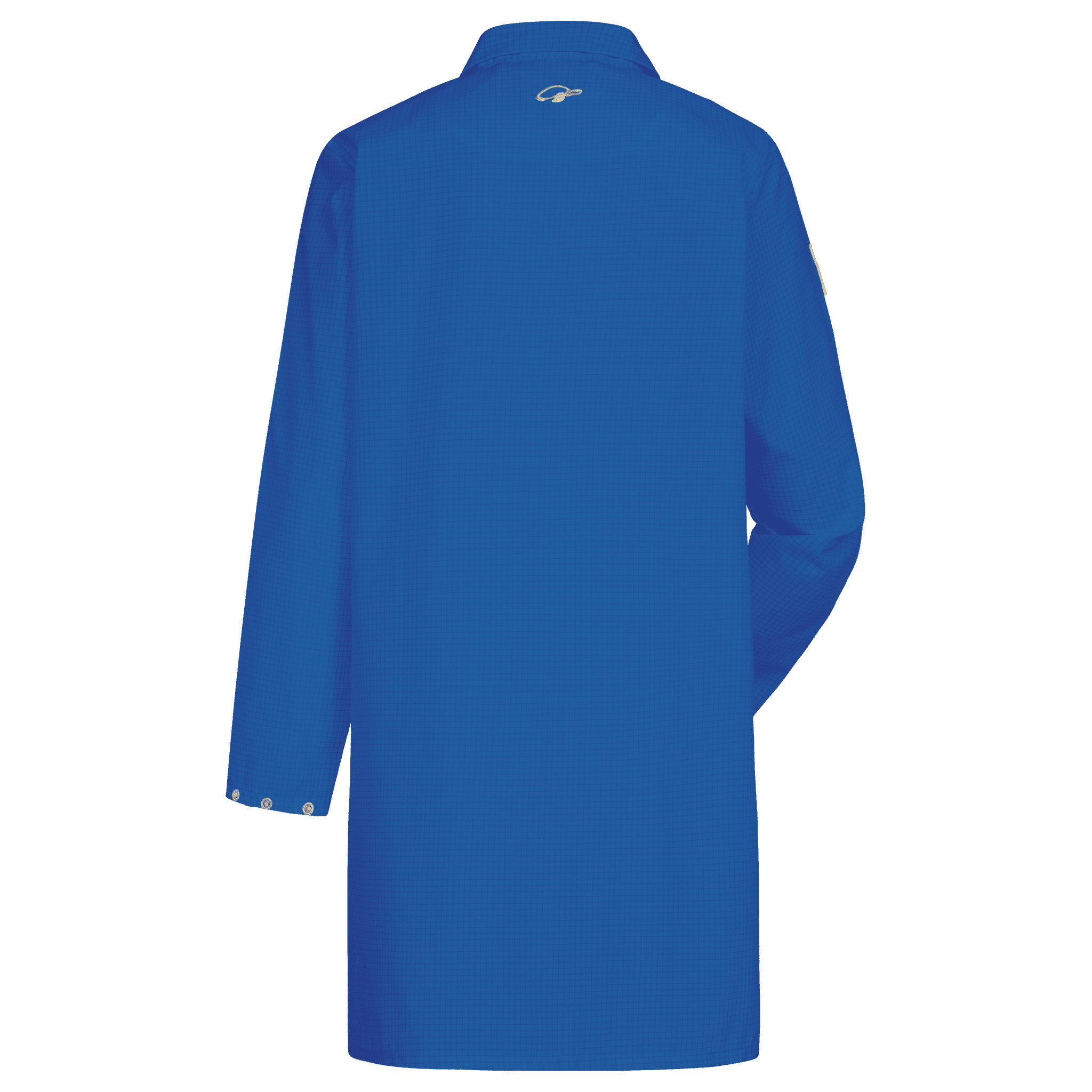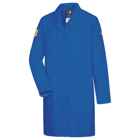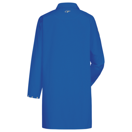 Single-coloured • cut without side seams • lapel collar • front with one-sided covered snap fasteners • 1 attached front pocket on the left • 2 attached side pockets with transverse openings • 2 front tucks on ladies‘ coat • sleeve hem adjustable via snap fasteners • EPA logo on right upper arm.Fields of application