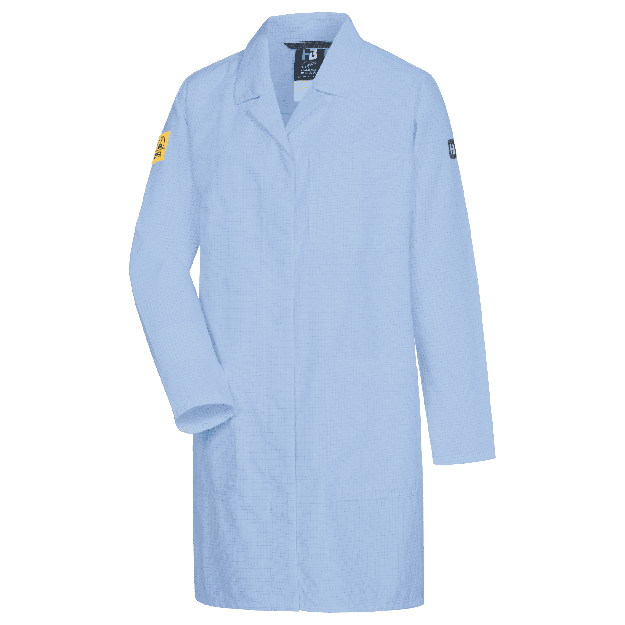 Single-coloured • cut without side seams • lapel collar • front with one-sided covered snap fasteners • 1 attached front pocket on the left • 2 attached side pockets with transverse openings • 2 front tucks on ladies‘ coat • sleeve hem adjustable via snap fasteners • EPA logo on right upper arm.Fields of application