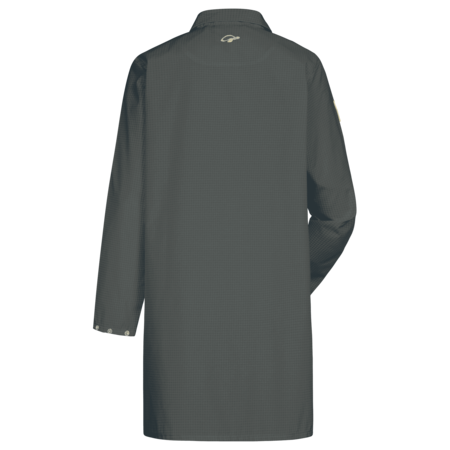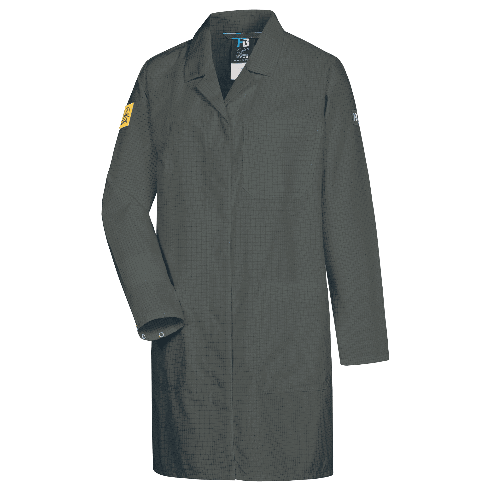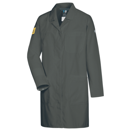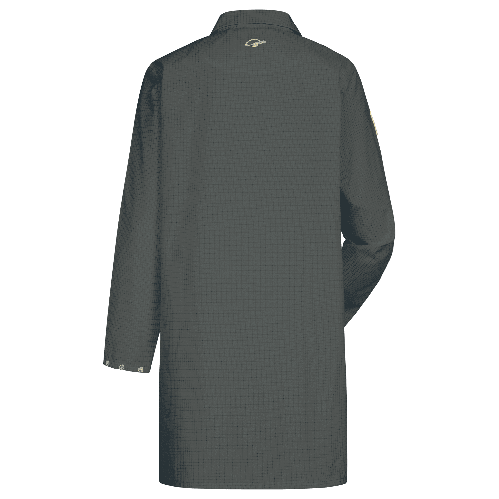 Single-coloured • cut without side seams • lapel collar • front with one-sided covered snap fasteners • 1 attached front pocket on the left • 2 attached side pockets with transverse openings • 2 front tucks on ladies‘ coat • sleeve hem adjustable via snap fasteners • EPA logo on right upper arm.Fields of application