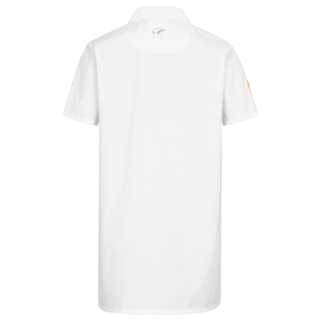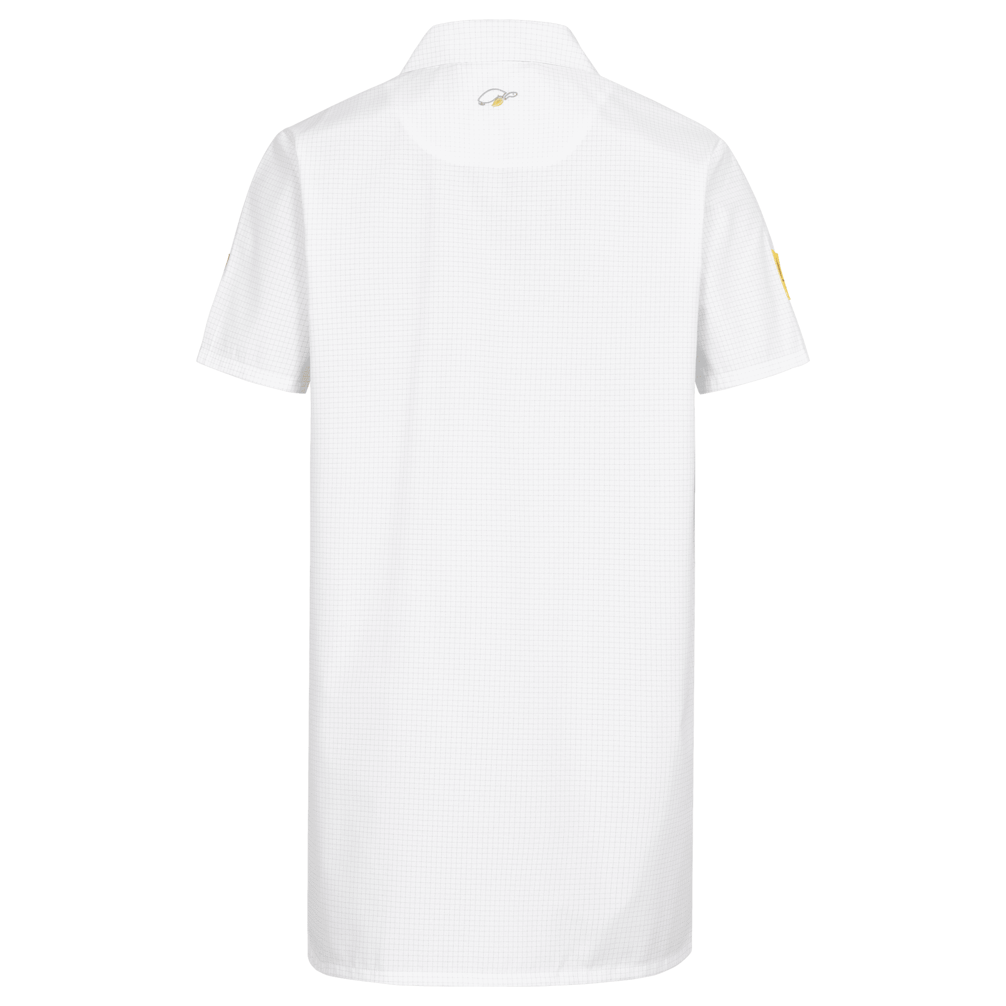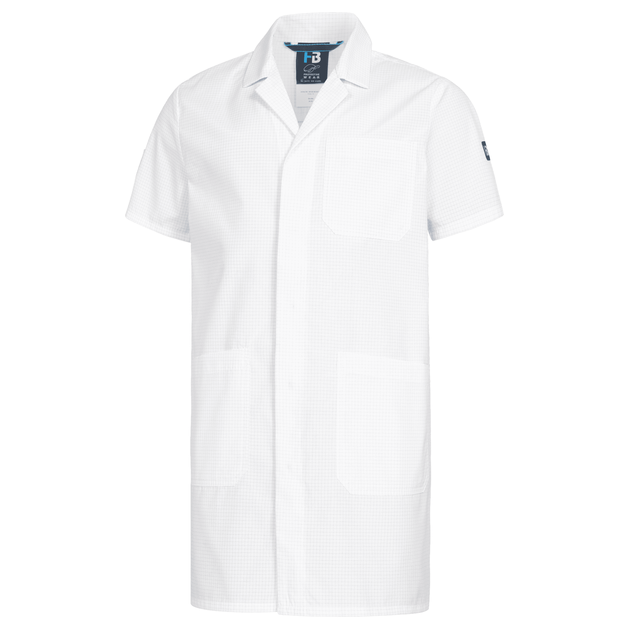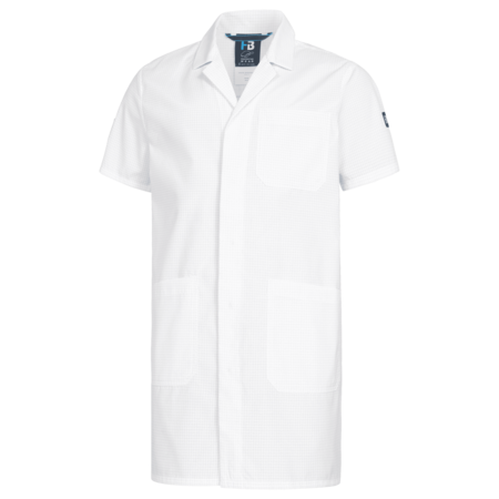 Single-coloured • cut without side seams • lapel collar • front with one-sided covered snap fasteners • 1 attached front pocket on the left • 2 attached side pockets with transverse openings • hemmed short-sleeve • EPA logo on right upper arm.Fields of application