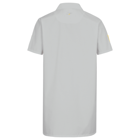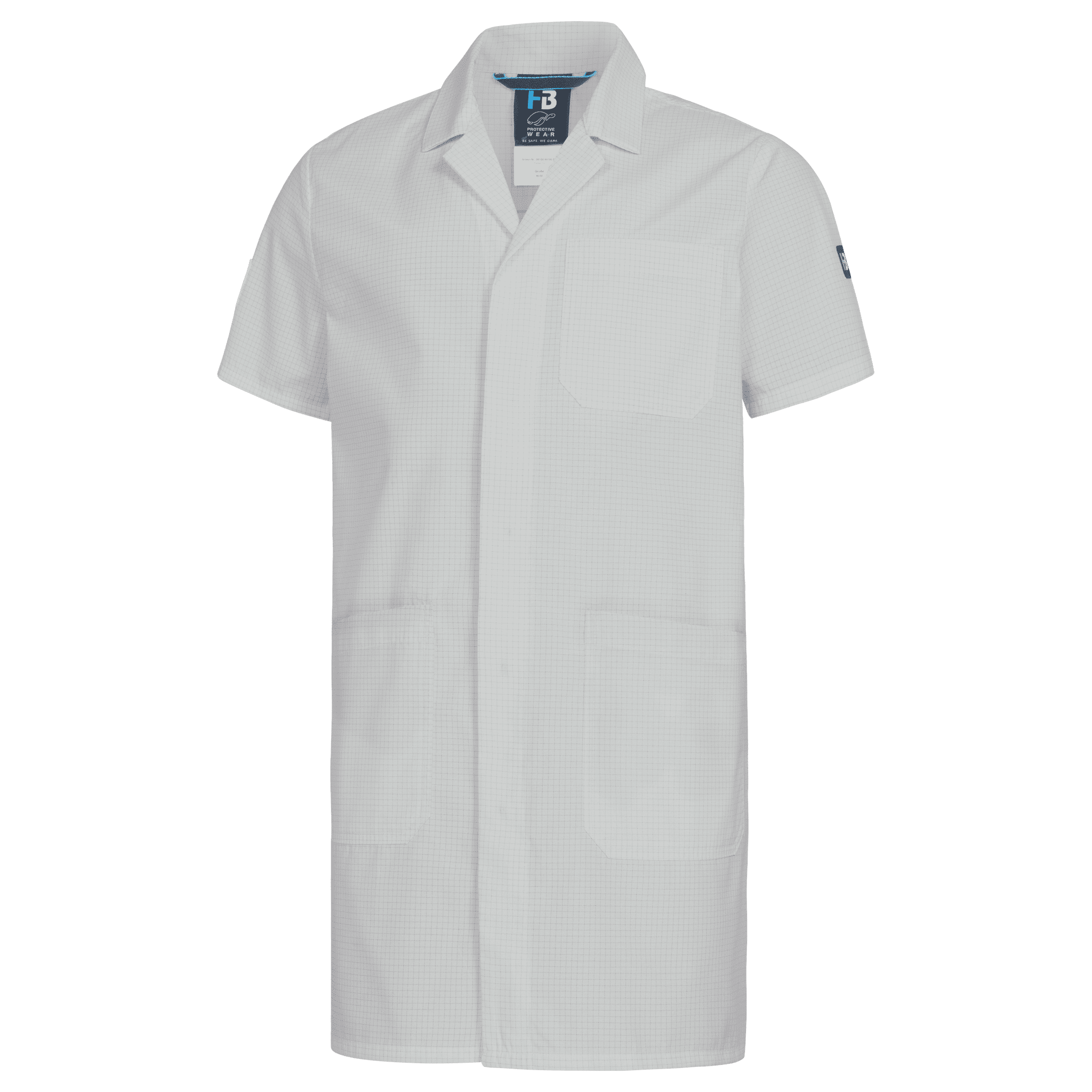 Single-coloured • cut without side seams • lapel collar • front with one-sided covered snap fasteners • 1 attached front pocket on the left • 2 attached side pockets with transverse openings • hemmed short-sleeve • EPA logo on right upper arm.Fields of application