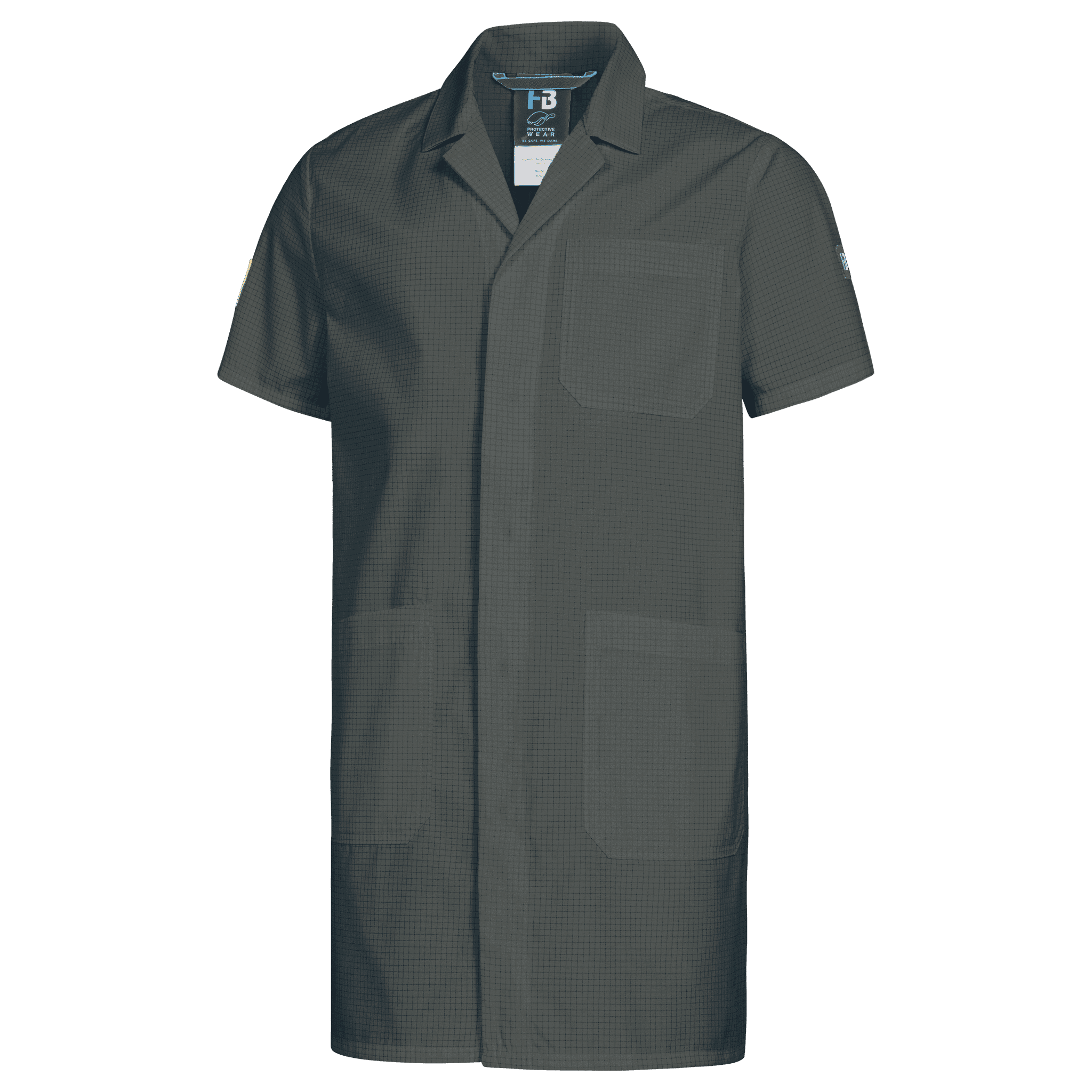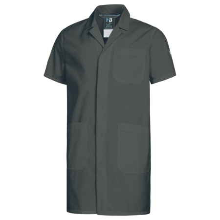 Single-coloured • cut without side seams • lapel collar • front with one-sided covered snap fasteners • 1 attached front pocket on the left • 2 attached side pockets with transverse openings • hemmed short-sleeve • EPA logo on right upper arm.Fields of application