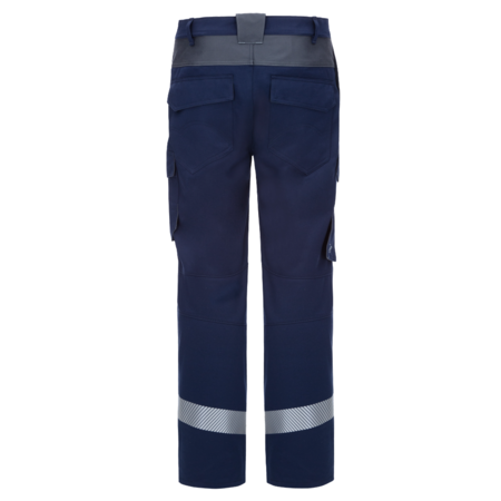 Two-coloured • added waistband with buttoning • covered zip fly • 2 side seam pockets • 2 back pockets, 1 ruler pocket on the right and 1 leg pocket on the left - each with flap and covered snap fastener • free hanging pocket pouch of ruler and leg pocket (+mobile phone pocket inside) • knee pockets with adjustable hook&loop fastener • flame-retardant reflective transfer tapes on the legs, suitable for industrial laundry • no high-visibility protective clothing acc. to EN ISO 20471 • manufactured with roof tile design.Fields of application
