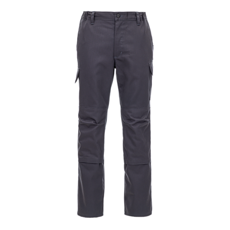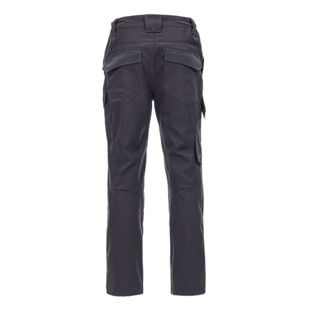 Single-coloured • added waistband (half elastic) with button • covered zip fly • 2 slant pockets • 2 back pockets, 1 ruler pocket on the right - each with flap and covered snap fastener • 1 mobile phone pocket on the left - with flap and hook & loop • knee pockets with covered hook & loop fastener • manufactured with roof tile design.Availability