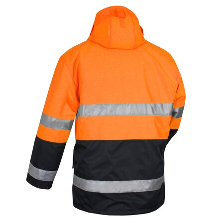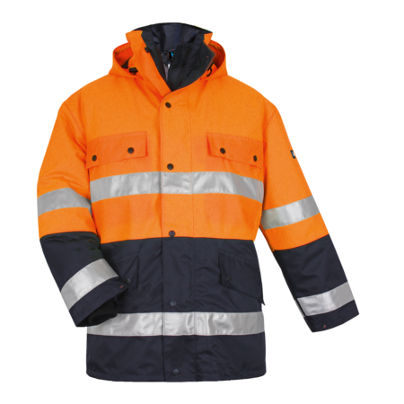 Two-coloured • outer material as direct laminate • with welded seams • with removable thermal jacket • high stand-up collar with built-in hood • fastener strip with concealed 2-way zip • chest pocket on left with built-in pen compartment • chest pocket on right with built-in mobile phone compartment • 2 side pockets with flaps and press stud closures • inside pocket on left with hook and loop fastener • hem can be adjusted with drawstring • sleeve width can be adjusted with press stud • with reflective strips.Fields of application