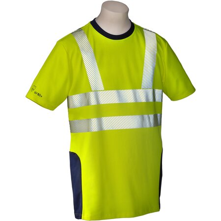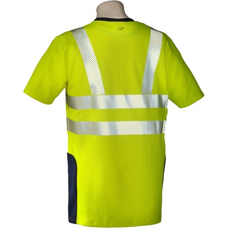 Two-coloured • round design and cut with contrast stitching in off-white • round neck opening • reflective film in body language, attached as patch, stretchy (segmented) • HB logo as direct embroidery on back • standard pictograms as direct embroidery on right sleeve hem.Fields of application